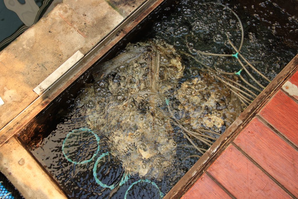 ย้อนไปเมื่อประมาณเกือบ 6 ปีที่แล้ว ช่องที่น้ำมาจากสะดือบ่อ (จากรูปคือบ่อหมายเลข 2) เริ่มต้นเดิมทีช่องนี้มีปัญหาที่สุดตอนทำบ่อแรกๆ เพราะไม่รู้จะเอาอะไรมาเป็นวัสดุกรอง